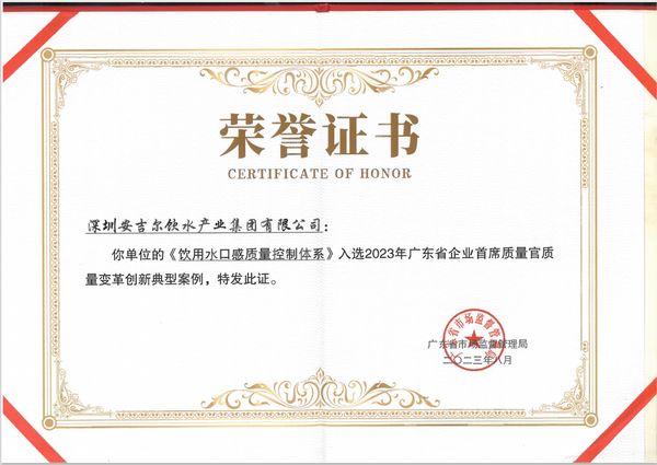 安吉尔《饮用水口感质量控制体系》获评广东省企业质量变革创新典型案例