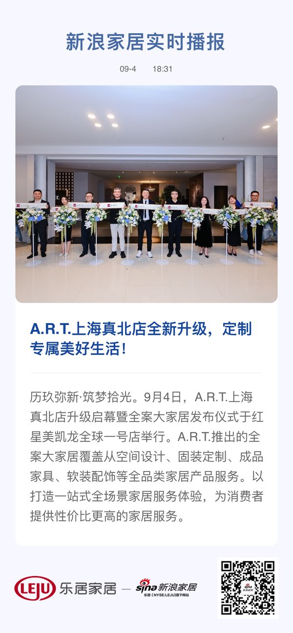 历玖弥新·筑梦拾光。9月4日,A.R.T.上海真北店升级启幕暨全案大家居发布仪式于红星美凯龙全球一号店举行。A.R.T.推出的全案大家居覆盖从空间设计、固装定制、成品家具、软装配饰等全品类家居产品服务。以打造一站式全场景家居服务体验,为消费者提供性价比更高的家居服务。
