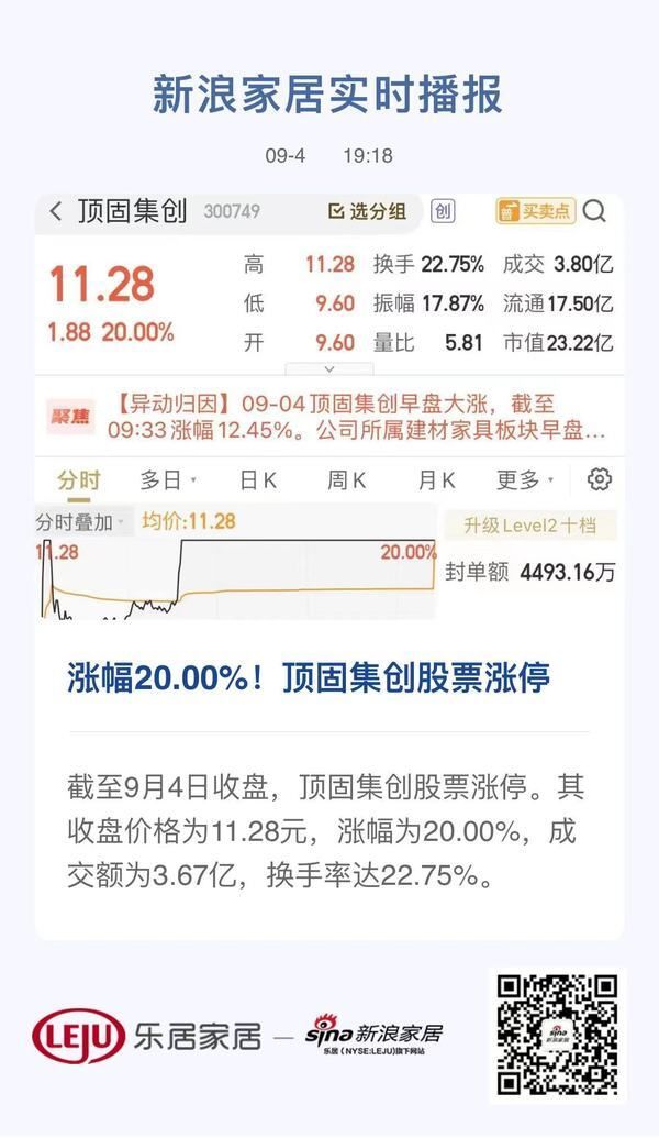 截至9月4日收盘,顶固集创股票涨停。其收盘价格为11.28元,涨幅为20.00%,成交额为3.67亿,换手率达22.75%。