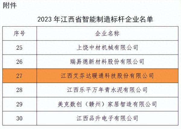8月31日,江西省工业和信息化厅发布2023年江西省智能制造标杆企业名单公告,江西艾芬达暖通科技股份有限公司荣誉上榜。