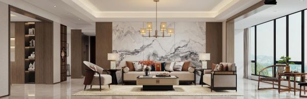 首先来到客厅,客厅是一个家主要的生活区,在设计中要注重整体的韵味。客厅主要以木质元素搭配,采用水墨画做沙发背景墙,所谓“山主人丁,水主财运”犹如“背椅山水”的寓意之美,与木质的相呼应,尽显中式的稳重大气,文人雅士之居,禅意十足。