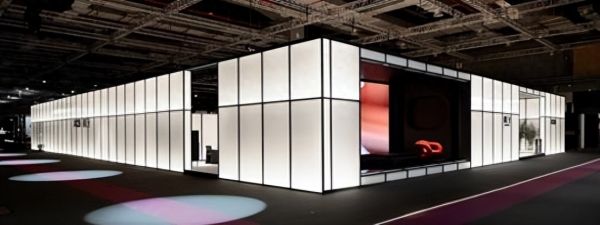 此次的展馆设计我们围绕着未来、革新、大胆试验的理念进行思考。Richard Meier曾说,“白色是一种极好的色彩,能将建筑和环境很好地分隔开。”此次展位外立面通体白色,整体采用可重复使用的金属结构和更为耐用的树脂玻璃进行装饰,线条简约流畅,光洁平直的白色立面,包裹着如外太空般深邃的橱窗,橱窗围水而建,影影绰绰。