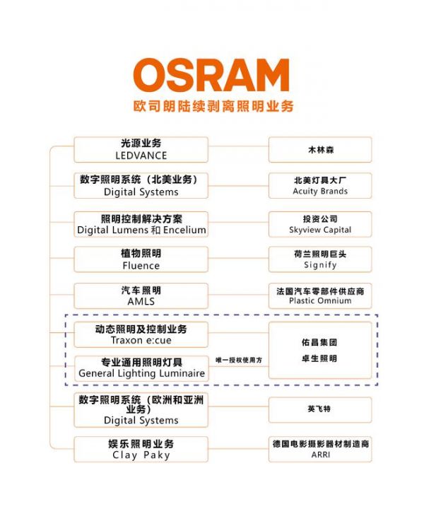 2022年12月,欧司朗(ams OSRAM)将包括其居世界领先地位动态照明控制e:cue在内的Traxon Technologies及专业通用照明灯具业务出售给佑昌集团。