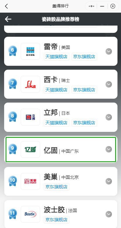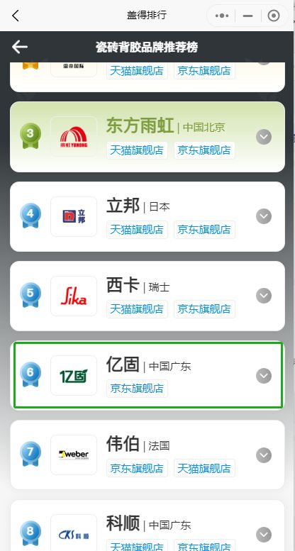 近日,亿固从众多辅料品牌中脱颖而出,亿固瓷砖胶荣登盖得排行「瓷砖胶品牌推荐榜」TOP9;亿固背胶荣登「瓷砖背胶品牌推荐榜」TOP6。