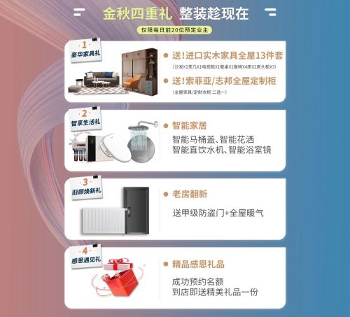 旧颜焕新礼:消费者如果需要翻新老房,全包圆将免费送上甲级精品防盗门以及全屋暖气片,提高您的家居安全和舒适度。