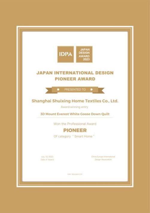 据了解,日本IDPA AWARD国际先锋设计大奖是国际设计领域的知名奖项之一,其评选严谨而公正,盛誉于世。水星家纺鹅绒被凭借其出色的设计理念和品质,成功获得该奖项的认可。