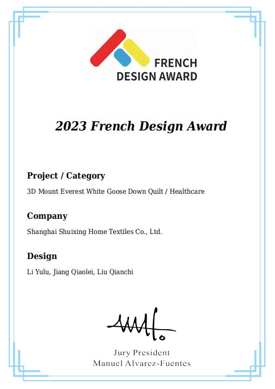 法国FDA大奖(法国设计奖)作为国际上享有盛誉的奖项,对于水星家纺鹅绒被也表示出了极高的认可。该奖项注重设计的创新性、美感和实用性,水星家纺鹅绒被凭借其独特的设计造型和出色的使用体验成功摘得2023年法国设计奖,这一成绩再次彰显了水星家纺在产品设计方面的专业水平和对细节的不懈追求。
