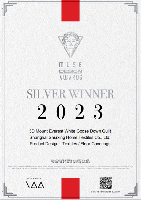 美国缪斯设计奖(MUSE Design Awards)是美国知名设计评选机构颁发的奖项之一,其评审团以严谨的态度评选出在设计领域取得突出成就的产品。水星家纺鹅绒被凭借其卓越的设计理念和出色的创新能力,斩获2023年美国缪斯设计奖银奖。这一殊荣不仅是对水星家纺品牌价值的肯定,也是对水星家纺在国际市场上的竞争力的认可。