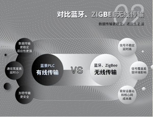 与蓝牙、ZiGBee无线传输相比较,蓝牙、ZigBee无线传输成本高,需要架设基站和核心网;信号不稳定,延时率高;信号覆盖差,易受环境影响。而蓝景PLC有线传输采用加密传输,更安全;通信宽度高,延时小;数据传输更稳定,适应性更强。