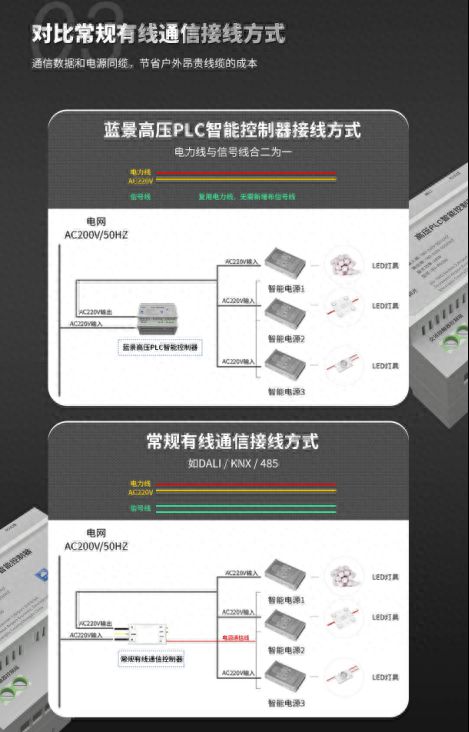 与常规有线通信接线方式相比,蓝景高压PLC智能控制器将电力线与信号线合二为一,实现智能控制系统免布线,安装更简单高效。
