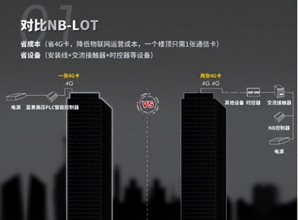 与NB-LOT对比,蓝景高压PLC智能控制器更省成本,同一座楼,只需要1张通信卡,可以降低物联网运营成本;安装时可以省去包括时控器、交流接触器等在内的其它设备,只需将电源和蓝景高压PLC智能控制器连接即可。