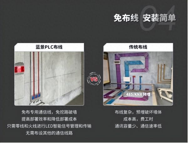 众所周知,传统布线较为复杂,预埋需要破坏墙体,成本高,费工时,通讯容量少,通信速率低。而蓝景PLC布线,无需布置专用通信线,免挖路破墙,也无需布设其它的通信线路。只需零线和火线进行LED智能信号管理和传输,可大大提高部署效率,安装过程更加简单高效。