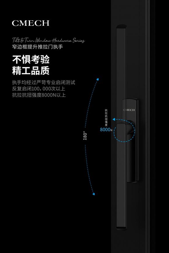 CMECH希美克窄边框提升推拉门系列执手还具有卓越的机械性能和耐腐蚀性能,执手经启闭和抗拉强度测试显示,可反复启闭10万次以上,抗拉强度8000N以上,性能坚固,经久耐用,提高整体使用寿命。