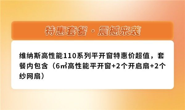 维纳斯高性能110系列平开窗特惠价超值,套餐内包含(6㎡高性能平开窗+2个开启扇+2个纱网扇)