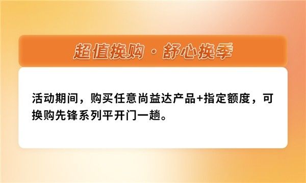 活动期间,购买任意尚益达产品+指定额度,可换购先锋系列平开门一趟。