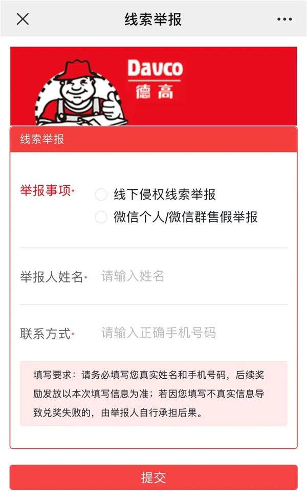 例如:发现线下实体门店或工厂存在制售德高美瓷胶假货行为,选择“线下侵权线索举报”,并进行以下材料的提交及填写。