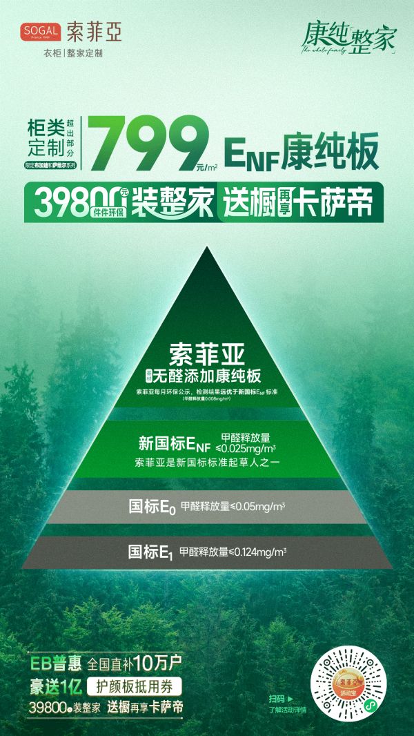 需要重点指出的是,与当前行业部分定制品牌在经营业绩增长乏力的情况下,以次充好、降低配置,使用环保等级较低板材低价促销的短期销售策略不同;索菲亚坚守行业大品牌的责任和担当,此次799元/㎡惠民政策,继续坚持对环保品质的保障,使用环保实木级的ENF康纯板,更有热门的百搭花色可供选择,真正让消费者享受“优惠到底,环保到底”的惠民福利。