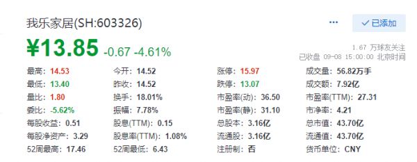 反转性的一幕是,因涉嫌超比例减持,我乐家居股东于范易及其一致行动人被证监会立案调查。9月8日,我乐家居快速下跌,截至发稿,跌超4%,报13.85元。