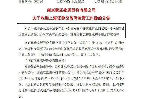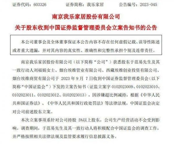 中国证监会迅疾出手。9月7日午间,我乐家居披露,因涉嫌超比例减持,股东收到中国证监会立案告知书。