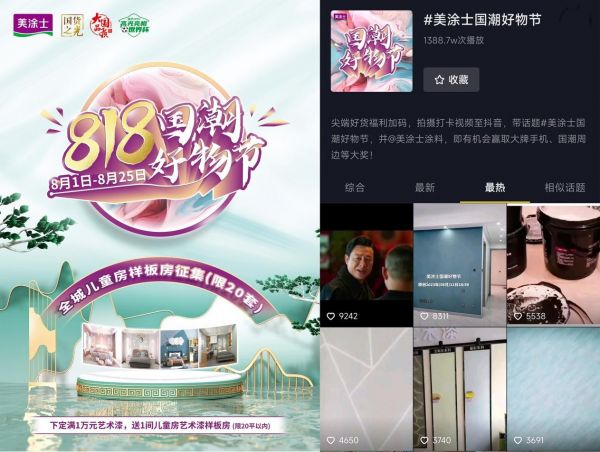 在本次全民抖音挑战赛上,『#美涂士国潮好物节』话题曝光量达1388W+,全方位、多频次、立体化的传播,使得国潮好物节火爆出圈,有效达到了为线下门店做引流转化的效果。