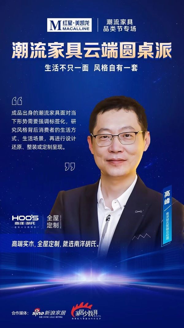 4月28日,由红星美凯龙主办的“潮流家具云端圆桌派”成功举行。活动以“生活不只一面,风格自有一套”作为主题。来自平台、行业头部品牌、权威媒体意见领袖等众多大咖进行深度思维碰撞,探索家具行业新趋势、新潮向。南洋胡氏营销总经理高峰受邀出席对话论坛,并发表观点。