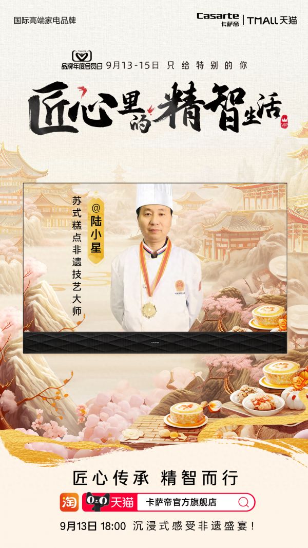 9月13日bigday当天,将邀请苏式糕点非遗技艺大师-陆小星走进天猫卡萨帝官方旗舰店直播间,使用卡萨帝家电进行非遗糕点-定胜糕制作,结合家电场景讲述非遗文化故事,沉浸式展示非遗文化魅力。
