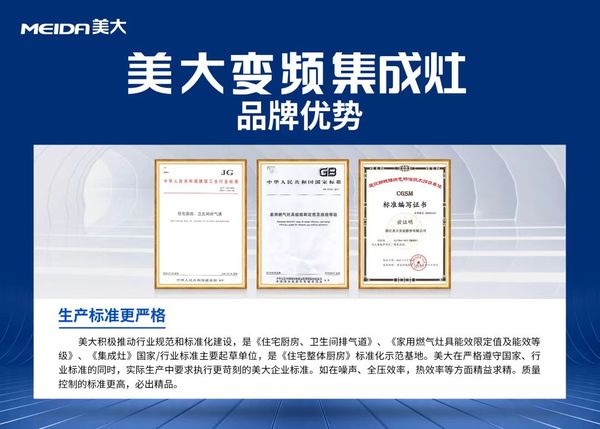 所谓前人栽树,后人乘凉。美大联合国家建设部共同起草了《住宅厨房卫生间排气道》行业标准、《家用燃气灶具能效限定值及能效等级》国家标准、《集成灶》行业标准,并荣获《住宅整体厨房》标准化示范基地,为集成灶行业规范化、标准化做出巨大贡献。