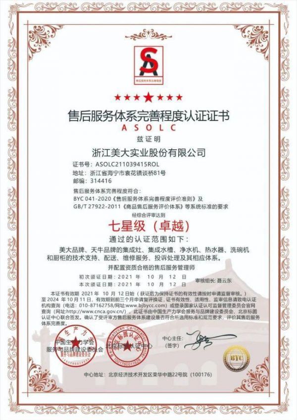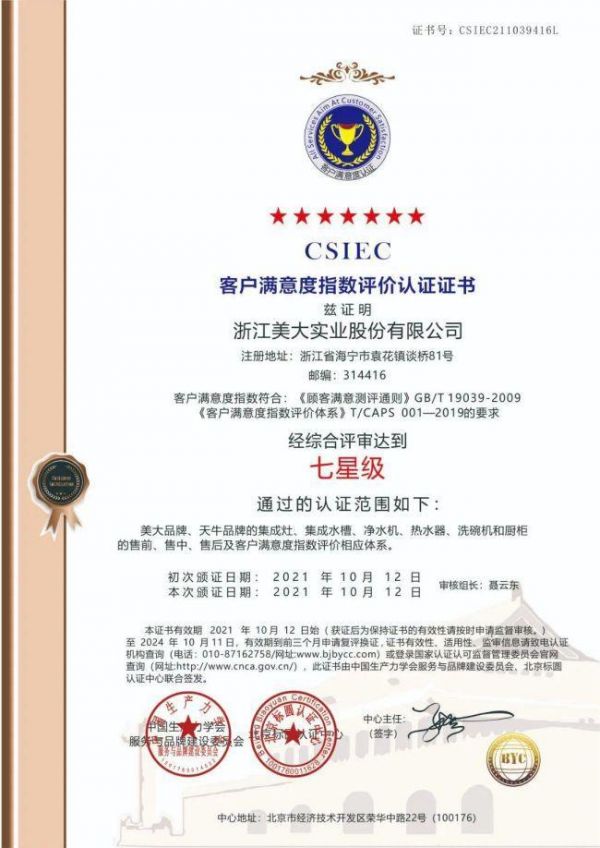 美大作为集成灶行业的创领者,品牌承袭高端基因,产品锻造高端精品,在品牌建设的过程中,拓展品牌文化、管理、研发、智造、产品、渠道、市场等多维发展思路,不断输出美大变频集成灶高端形象。同时品牌的塑造并不是建立空中楼阁,夯实用户服务才能加固根基,美大坚持“以人为本”的服务核心,倾听用户诉求、升级用户体验、深化用户沟通,并获得售后服务体系完善程度七星级(卓越)认证、顾客满意度指数评价七星级认证“双七星”认证,想用户之所想,予用户之所求,建立品牌与用户双向奔赴的长远之道。