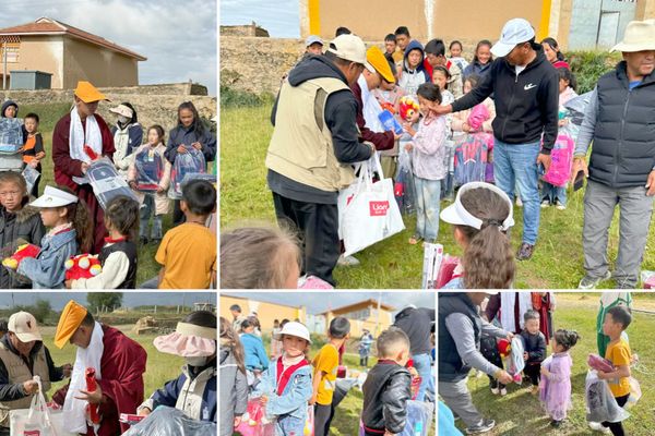 捐助仪式上,我们见到了那群天真可爱的小朋友,他们大多瘦小而黝黑,还有一些儿童因为要早出放牧而没能参加这次仪式。不过我们在来之前已经进行了沟通,当地村子的儿童都能够获得我们捐助的书包、衣服、文具、取暖器以及特别带有拼音备注的课外读物等。