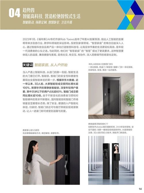 通过智能科技全品类产品享受智慧生活,是年轻消费者的心仪之选。近一年来,京东3D人脸、大屏智能锁品类成交额同比增长超100%,智能门成交额同比增长超10倍,智能灯、智能窗帘成交额同比增长超50%,智能开关成交额同比增长70%,智能浴霸成交单量同比增长超100%,智能马桶、智能马桶盖成交单量同比增长60%,智能花洒成交单量同比增长70%,智能浴室柜成交单量同比增长100%。智慧科技带来的舒适体验,让人们在快节奏生活下享受片刻松弛。