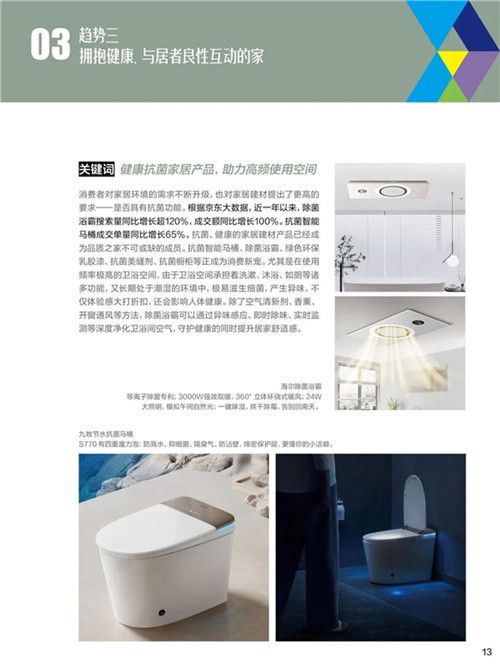 随着大众健康意识的增强,抗菌、健康的家居建材受到更多家庭关注。京东大数据显示,无醛地板成交单量同比增长超60%,“除菌”也成为搜索关键词,近一年来“除菌浴霸”搜索量同比增长超120%,成交额同比增长100%,抗菌智能马桶成交单量同比增长65%。