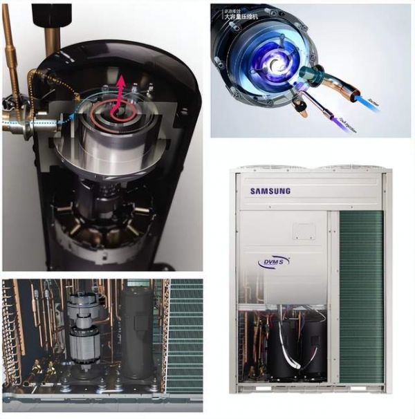 30HP超大模块室外机,均由单模块构成,节省室外机占地面积,也令系统管路由此得到简化,为用户释放可使用的空间。另外,超长配管技术,总管长1000m,单管长220m,室外机高低差110m,灵活应对各种形式、规模建筑设计与摆放需求。作为空调系统的核心部件,压缩机动力强劲与否,直接关系着空调系统是否高效节能。三星全变频多联式中央空调搭载自主研发的三星高压腔气液增焓涡旋式直流变频压缩机,采用线性变壁厚涡旋盘设计,增加吸气空间吸入冷媒的同时,增强排气部位的强度,急速运转同时保持稳定状态,最终使得压缩机排气量大幅提升,发挥出众使用效率。