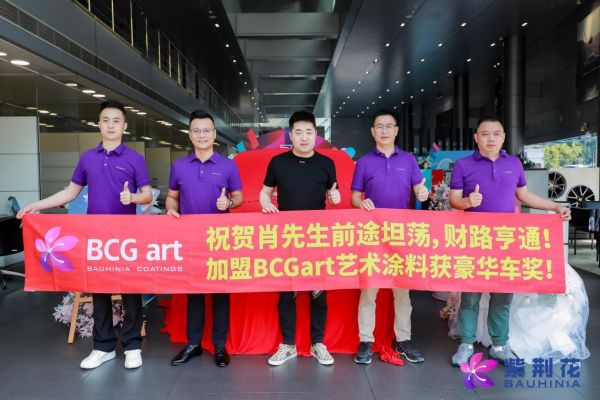 2023年9月16日,紫荆花重庆地区新签约经销商交车仪式在重庆南岸保驰捷中心隆重举行,紫荆花BCG艺术涂料项目总监张伟先生、紫荆花家装涂料华中南总监陈宇先生、紫荆花家装涂料重庆省区总监蹇兵先生等紫荆花业务团队与紫荆花BCG艺术涂料重庆省区新签约经销商肖骁先生共同出席。