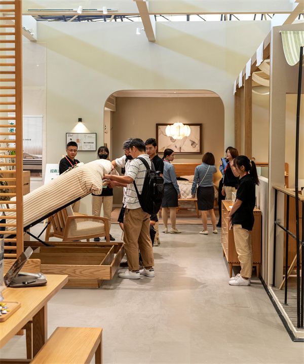 在场景布置上,除了以更生活化的“客厅”、“餐桌”、“卧室”、“书房”等使用场景成套展现外,源氏木语还以“有木,有柔软”、“有木,有童趣”为主题,布置了更具沉浸式场景体验的轻奢区、儿童区、床垫区;打造了不同风格的样板间,如以“有木,有桃花源”为主题的樱桃木卧室,以“有木,有格调”为主题的轻奢风卧室。