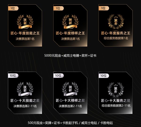 本届大赛以“致敬平凡力量”为主题,面向全国家居蓝领师傅,将经过报名、投票环节,最终根据排名决出“年度技能之王”“年度榜样之王”“年度服务之王”各1名师傅,奖励5000元奖金、威克士电锤、奖杯和证书,“十大技能之星”“十大榜样之星”“十大服务之星”各10名师傅,奖励500元奖金、奖牌、证书、卡胜起子机/威克士电钻/卡胜电钻。