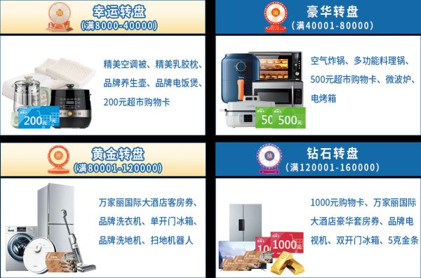 注:参与抽奖活动需加盖售后服务章的购物凭证与付款凭证,满8万以上需跨2个品牌方可参与抽奖。如高额转盘礼品抽取完毕,可顺延参与其他金额转盘抽奖,根据实付金额对应抽奖次数。