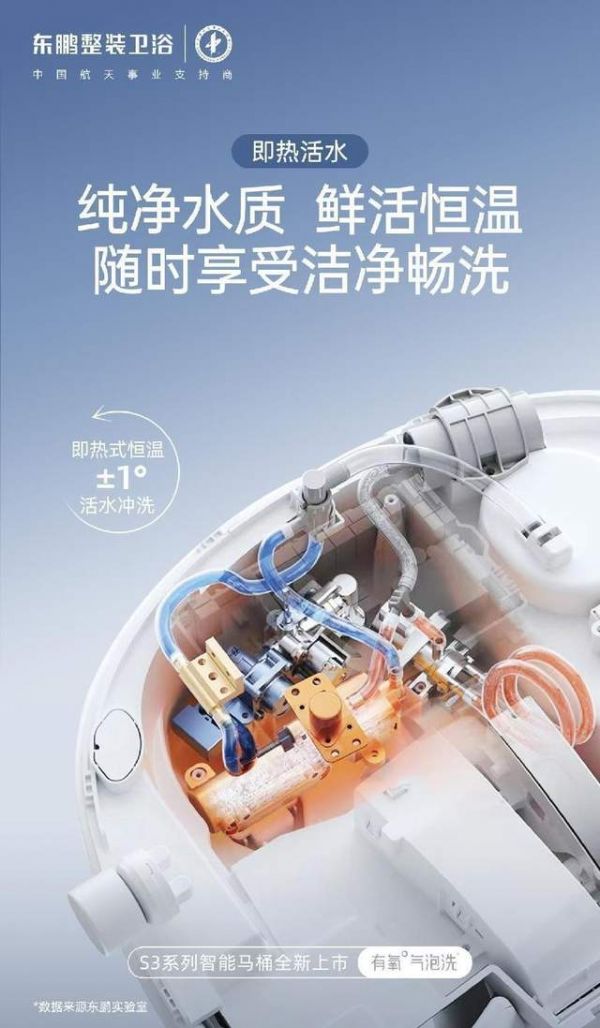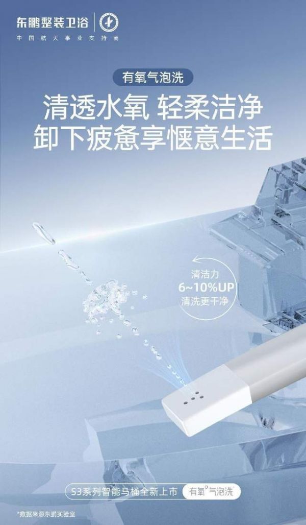在卫浴空间内,马桶是最易“藏污纳垢”之处,存在较大的健康卫生隐患。东鹏整装卫浴出于关爱用户健康的考虑,攻克常规智能马桶冲洗慢、不干净、刺激大等难点,采用航天推进器流体力学原理打造有氧气泡洗技术,创新研发出防溅防臭、抗污隔菌的S3智能马桶,人体落座后6秒出泡,丰盈水量及柔和气泡带来SPA级舒爽感,是广大消费者尤其是女性消费者的绝佳选择。