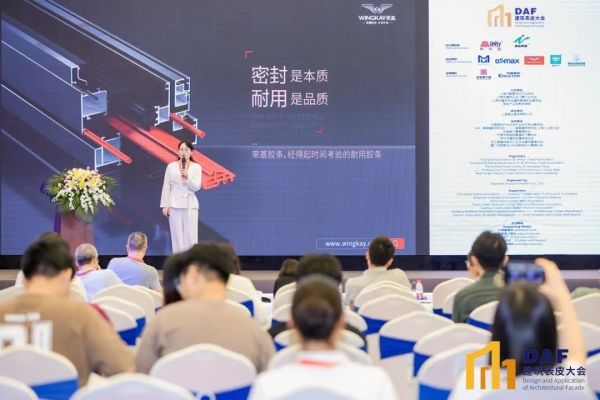 在展会同期举办的2023亚洲建筑表皮设计与应用国际大会(简称:上海DAF大会)上,荣基总经理刘进容,以“整体耐用,才有作用”为主题,为现场嘉宾分享了荣基坚持27年“只做好胶条”的经营理念。