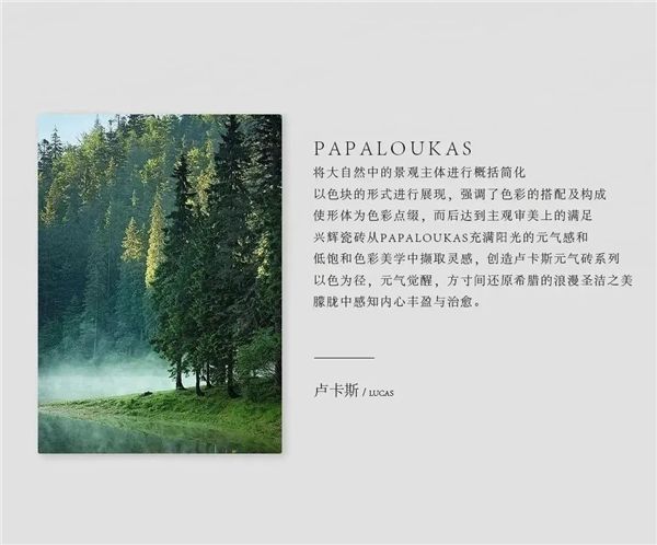卢卡斯系列的设计原点来源于二十世纪上半叶的希腊画家斯皮罗斯·帕帕卢卡斯的画作,Spyros Papaloukas以其现代主义绘画及光线充足的风景画而闻名,每一幅艺术作品,都被标记了治愈和元气的注脚,他对于色彩有着纯粹的追求,多以柔和低饱和度的色彩进行创作,总能营造出一种温柔、清醒治愈的氛围,有着春天细腻温暖的气息,予观者惬意舒适、净化心灵的感受,仿佛让人置身在古典童话里。