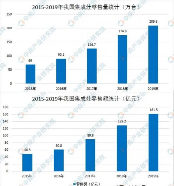 走过萌芽阶段,集成灶行业犹如“开挂”,步入爆发期。数据显示,2015年至2019年,集成灶行业零售额从48.8亿元增加至161.5亿元,年复合增长率达34.98%;零售量从69万台提升至209.8万台,年复合增长率达32.08%,整体呈现快速上升趋势。