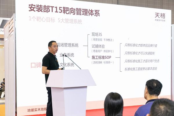 高标准的服务规范和保障体系,需要强大的组织、明确的制度以保证其真正的落地执行,这也是天格推出“总部负责安装”的根本所在。据介绍,天格地板安装服务站主要通过“现场管理系统、业务系统、文化系统、支持系统、督导系统”五大管理系统,围绕“用户口碑”这个唯一靶心持续开展工作,从而不断提升效能,长效迭代服务。不仅总结整理了“用心处理地面、专心对接墙面、精心配备工具、匠心服务周到”这一“面面俱到”服务要求,更细化了包含地板摆放、切割区布置、防尘通道布置、地板试铺、地板安装、踢脚线安装等一整套清晰规范的施工标准化SOP。