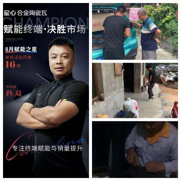 主动营销专员韩超就是其中的一员,退伍军人出生的他将雷厉风行、一丝不苟的部队作风带到了实际工作中!不管是烈日酷暑,还是寒冬腊月,哪里经销商有需要,哪里就有他们的身影!从清晨的5、6点到晚上的7、8点,都是他们忙碌的身影,协助当地经销商,服务好每一位客户,就是他们的终极目标!负责任、将实干,这是星心合金陶瓷瓦经销商们对这支队伍的真实评价!