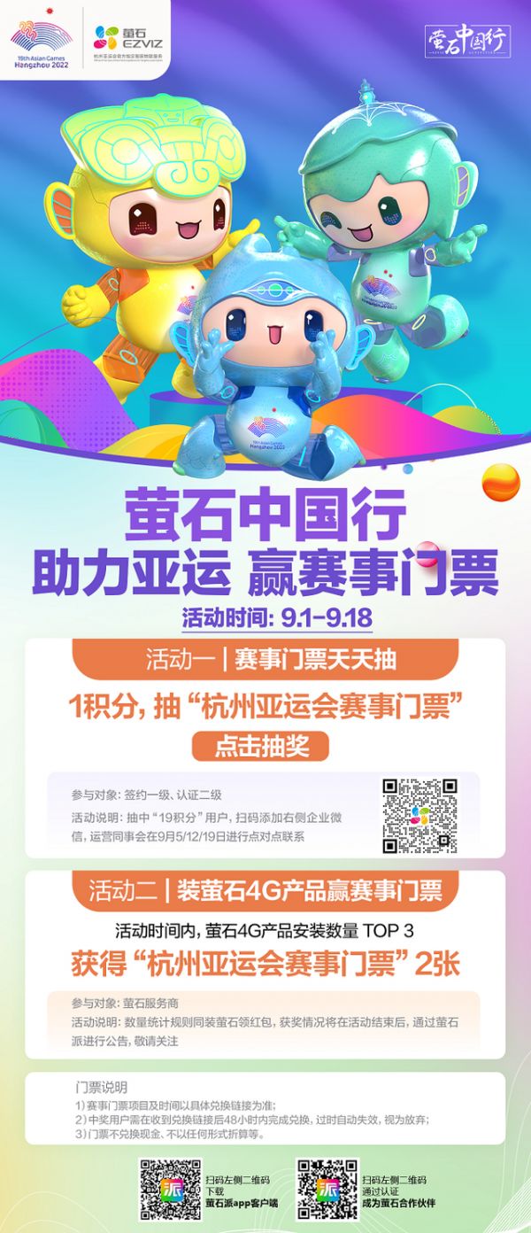 9月1日-9月18日活动期间,萤石发起了#中国行助力亚运 赢赛事门票#活动,以萤石派客户端为活动入口,为萤石全国经销合作伙伴派送福利。活动一,赛事门票天天抽,经销合作伙伴可在萤石派使用1积分抽取杭州亚运会赛事门票。活动二,装萤石4G产品赢赛事门票,活动期间,萤石4G产品安装数量前TOP3的服务商可获得“杭州亚运会赛事门票”2张。