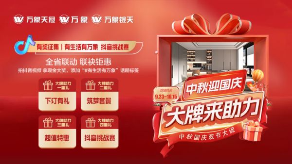9月23日-10月15日,万象天冠品牌/万象品牌/万象银天品牌以“中秋迎国庆 大牌来助力”为中秋国庆主题大促活动震撼来袭。板材新品上新、多档实用好礼、超值定制套餐等多重钜惠,一次爆发,惊喜连连,更有“有生活有万象”抖音挑战赛贯穿全程,晒出您的中秋团圆、黄金假期、祖国大美风光,就有机会获得千元现金大奖。