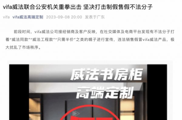 近日,vifa威法高端定制官方消息称,公司近期对市面上违法销售假冒vifa威法产品的行为进行了严厉打击。近期重拳出击,成功抓获了制假售假团伙。