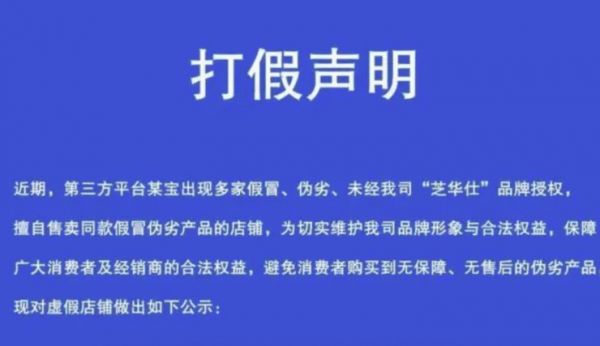 4月17日,“芝华仕品牌官方”微信号发布打假声明,公示了售假芝华仕产品的某电商平台店铺名单,包括芝华仕头等舱实体店联营、芝华仕头等舱15年老店、芝华仕品牌官舰店等在内的58家店铺,其工作人员表示,打假名单上的店铺均未获得芝华仕品牌授权,也不存在加盟代理商。