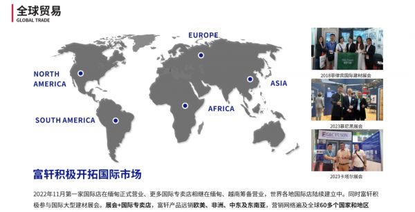 同时富轩积极参与国际⼤型建材展会。展会+国际专卖店,富轩产品远销欧美、⾮洲、中东及东南亚,营销⽹络遍及全球60多个国家和地区。
