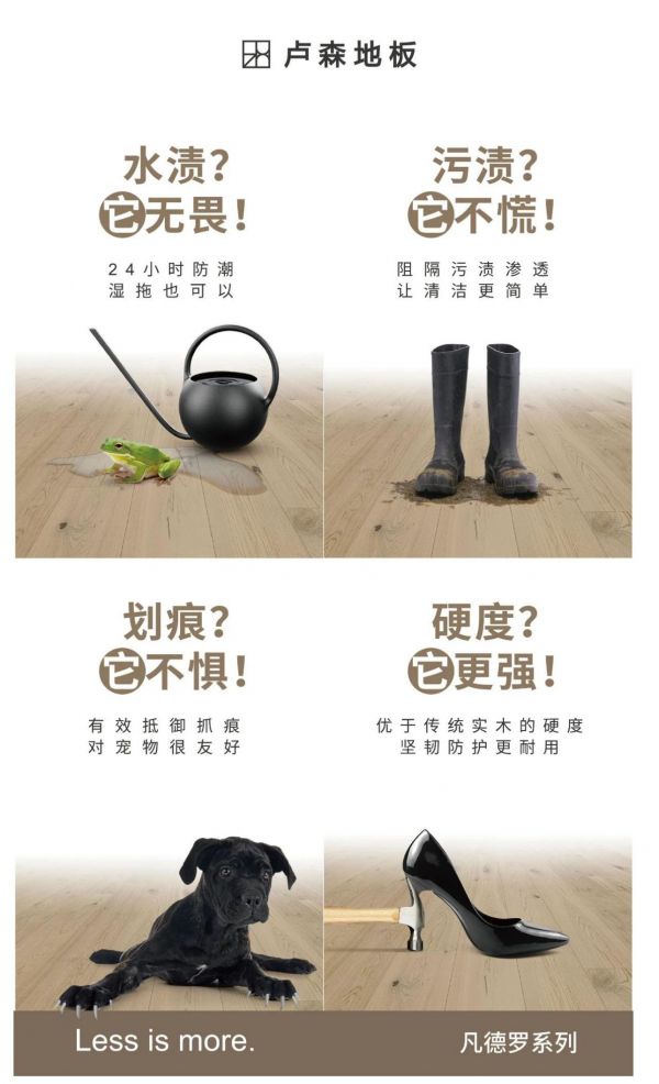 卢森地板花色丰富,款式新颖多元。产品品类多元,涵盖强化木地板、实木强化地板、实木复合地板、拼花地板、定制地板、牛皮地板、运动地板、防水地板等品类。重要的是卢森地板从未停止产品升级和创新的脚步。卢森新品凡德罗超实木地板就是基于消费者需求而创新研发的。凡德罗超市地板由高等级珍贵实木打造的精致细腻表面,生动诠释了简而不凡的生活美学。突破性的三大黑科技,将抗冲击、耐刮擦、耐脏污、防潮等实用性与美观性完美结合在一起,给家居带来更轻松、愉悦、舒适的生活体验。