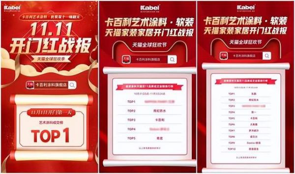 作为艺术漆头部品牌,卡百利是吃到新零售发展红利的涂企代表。资料显示,在线上新零售方面,卡百利近年来成绩斐然,在2022年双11首日卡百利就斩获天猫艺术涂料成交榜TOP1,跃居天猫双11“油漆涂料”排行榜TOP3,双11期间成交突破3000万;而在2023年的618购物狂欢节里,卡百利再度出击,在天猫618狂欢节油漆涂料品牌销售榜中荣登排名TOP3,天猫家装家居2023年618全周期战报涂料榜单TOP4、艺术涂料行业TOP1。