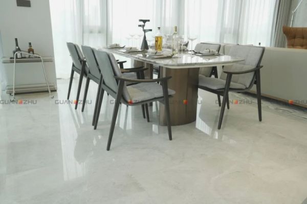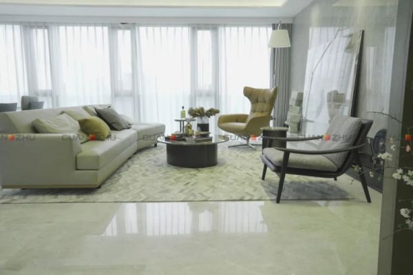 客餐厅承载着会客交友、日常休憩娱乐的重要功能。设计师着眼将将理想生活方式转变为切身感知的生活体验,墙面、地面应用了冠珠瓷砖抛釉砖,光泽度恰到好处,让整个空间通透明亮。自然光映衬下,瓷砖细腻纹理随光影流转,营造悠然惬意的空间气质,诠释项目简而不凡的设计理念,承载现代都市居者对于人与自然共生状态的诉求。